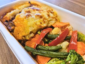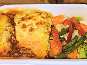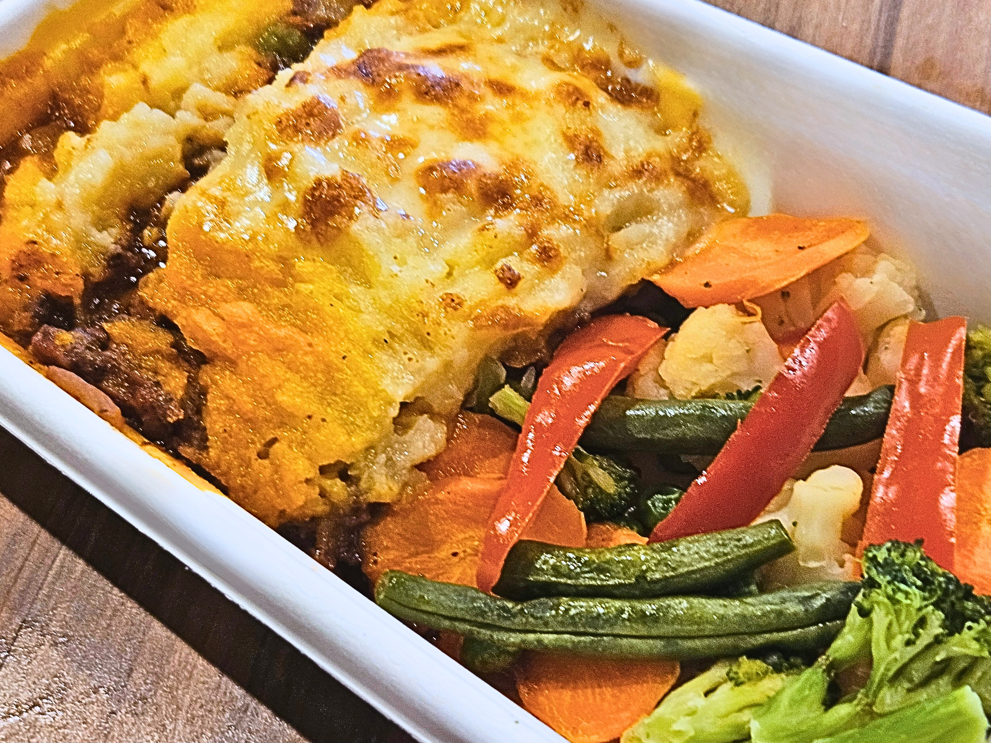 A hearty, comforting classic, featuring ground beef and lamb, mixed vegetables and a rich gravy based sauce, topped with a layer of cheesy mashed potatoes.